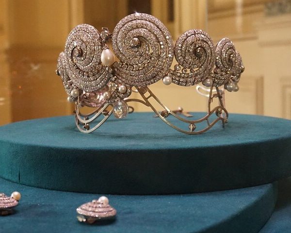 - A platinum tiara fixed with over 2.000 diamonds and white pearls belonging to Princess Shivakiar, wife of King Fuad I.