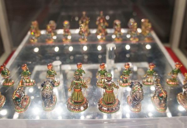 - A gold chessboard and the chess consisting of 32 pieces inlaid with 425 stones from diamonds and decorated with colored enamel. This collection belongs to King Farouk.