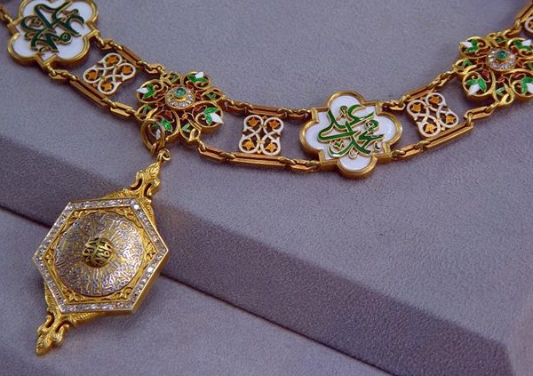 - A diamond and emerald inlaid collar belongs to Mohamed Ali Pasha. This collar consists of 16 decorative motives, eight having the inscription “Mohammed Ali” while eight in the shape of a gold flower with diamonds.